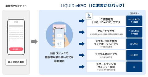 事業者向けに提供される「LIQUID eKYC」の「ICおまかせパック」は、マイナンバーカードや運転免許証などのICチップを活用した本人確認方式を一式提供し、各ユーザーに対して離脱率が最も低い読み取りチャネルを自動で案内するサービス。事業者は特別な開発が不要で、1つのAPIで、ル方式を含むさまざまなIC読み取り方式に対応できる。