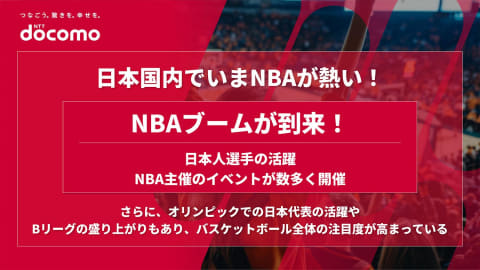 これまでも「ドコモ MAX」「ドコモ ポイ活 MAX」の契約者向けにDAZN for docomoを通じて追加料金不要で、国内プロバスケットボールリーグ「B.LEAGUE」の試合配信を行なってきた。ドコモではNBAファンは日本に約50万人と見込んでおり、こうしたファンをドコモのサービス内に取り込んでいく狙い。