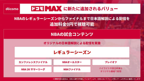 NTTドコモは5日、「ドコモ MAX」「ドコモ ポイ活 MAX」契約者向けに、ナショナル・バスケットボール・アソシエーション(NBA)の試合などの配信サービスを10月22日から追加料金不要で提供すると発表した。