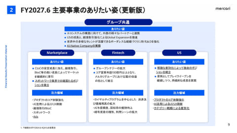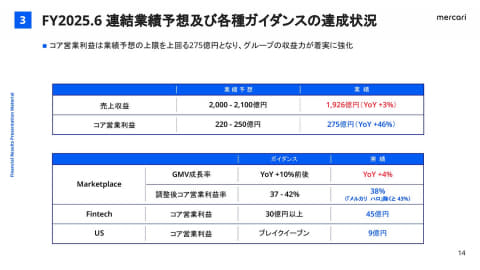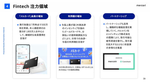 2026年6月期は、メルカードの会員増のほか、メインカード化を促進。また、メルカードゴールドへの転換など、1人あたり利用額の増加やパートナーシップの拡大を図る。パートナーシップの強化の第1弾として暗号資産取引所の「コインチェック」と「メルコイン」の協業も発表している。2026年6月期はコア営業利益50-75億円を目指す。