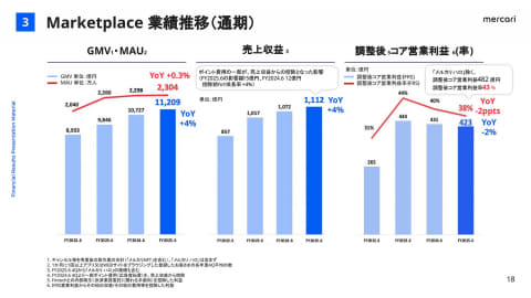 GMVは1兆1,209億円、月間アクティブユーザー(MAU)は2,304万人(前年比0.3%増)とユーザー数は横ばいで、売上収益も1,112億円で4%増となった。調整後コア営業利益は423億円(前年同期比2ポイント減)で、コア営業利益率は38%。