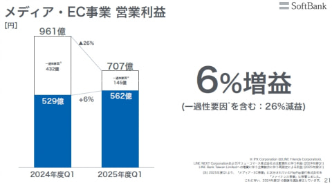 メディア・EC事業は売上高4,069億円(同2%増)と微増にとどまった。前年同期にLINEヤフーグループで計上された子会社(IPX Corporation、LINE NEXT Corporation、バリューコマース)の支配喪失に伴う利益が剥落したことにより、営業利益は707億円(同26.4%減)となったが、これらの一過性要因を除けば6%増益。