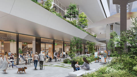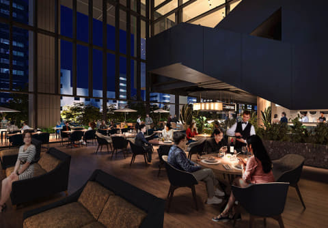 商業エリアは「まちのコミュニティハブ」をテーマに、オフィスユーザーに加えて地域住民に向けても、「食」を中心とした新たな出会いや発見、自分らしく過ごせる時間を後押しするとしている。
