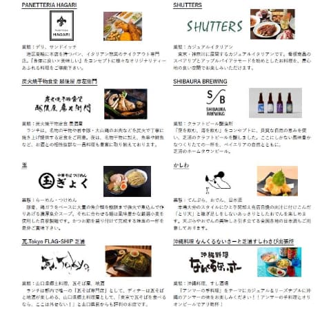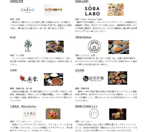 店舗のカテゴリーはほぼすべてが飲食店で、飲食以外ではコンビニエンスストア、フラワーショップ、シェアオフィスがある。