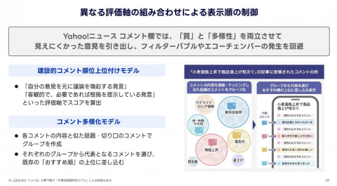 このほかにも、フィルターバブル対策として、Yahoo!ニュースのコメント欄に「質と多様性」を重視した建設的コメント順位付けモデルを導入している。ロジカルなコメントだけでなく、投稿内容を分析して複数の意見をグルーピングし、特定の意見に偏らないように表示順を調整している。また、信頼性の高いコンテンツを優先的に表示する「プロミネンス」の取り組みも進めており、ユーザーが正確な情報に触れる機会を増やすことで、偽情報に惑わされない心理的防御(プレバッティング)を促すとしている。