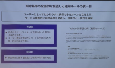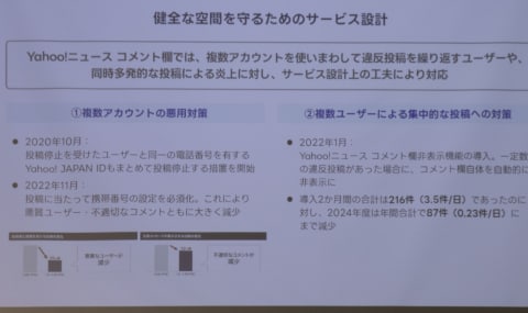「Yahoo!ニュース コメント欄」では、投稿時に携帯電話番号の登録を義務付けることで、複数のアカウントを使い違反行為を繰り返すユーザーが多かった問題に対処している。投稿内容の削除基準については、各サービス間でルールを統一し、禁止投稿の具体例を盛り込んだガイドラインを公開。