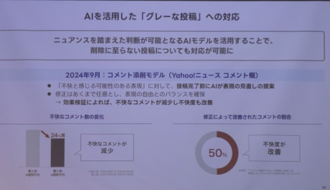 ユーザーがルールを理解しやすくすることで、投稿時点でのトラブル抑制を図る。さらに、AIには不適切な投稿の“削除”だけでなく、警告にも活用。例えば、「コメント添削モデル」では、不快と感じる可能性のある表現に対して、ユーザーが投稿する直前にコメント内容の見直しを提案する。修正は任意とし表現の自由とのバランスを確保したという。