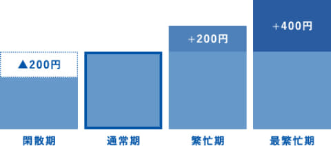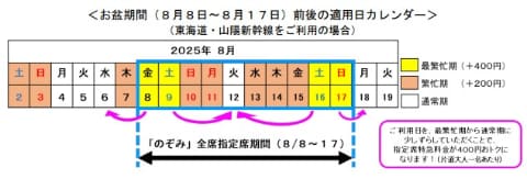 なお、新幹線を含む特急列車の指定席特急料金はシーズン別に異なり、東海道新幹線の場合、8月8日~9日、16日~17日は最繁忙期で+400円、8月10日~11日、13日~15日は繁忙期で+200円、8月12日および全席指定期間後の18日~21日は通常期となります。