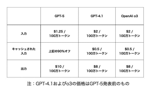 以下はAPIから使った際のコストだが、少なくとも入力については、o3とGPT-4.1の100万トークンあたり2ドルに対し、GPT-5では1.25ドルとこれまでのモデルよりも安くなる。