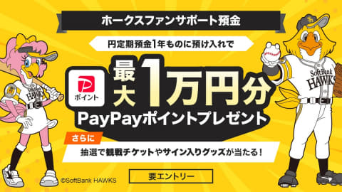 また、合計10万円以上の預け入れで、「2025 パーソル クライマックスシリーズ パ」の観戦チケットや、サイン色紙などのホークスグッズが抽選で当たる特典も用意する。抽選権は合計10万円預け入れごとに1本付与される。