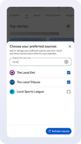 Preferred Sourcesでは、検索時に対象メディアの関連コンテンツを優先的に目立つ形で表示する機能。ソース(メディア)を選択すると、それらのソースは「Top Stories(トップストーリー)」や検索結果ページ内の専用セクション「あなたのソースから(From your sources)」に高い頻度で表示されるようになる。他のサイトのコンテンツも引き続き表示され、選択内容の変更も可能。