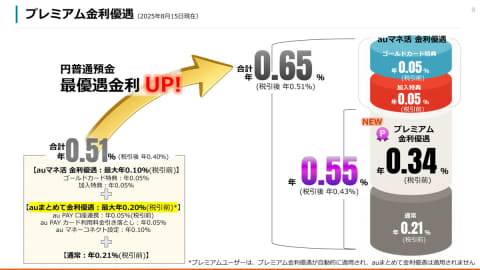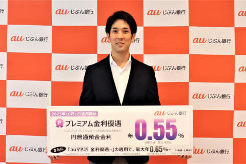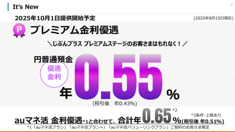 auじぶん銀行は、顧客向け優遇プログラム「じぶんプラス」のプレミアムステージユーザー限定特典として、「プレミアム金利優遇」を10月1日から開始する。プレミアムユーザーなら無条件で円普通預金の金利が0.55%(税引前、以下同)になる。また「auマネ活プラン」など対象のau料金プラン契約による金利優遇と合わせると合計年最大0.65%の金利が適用される。