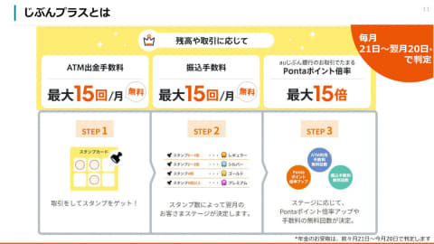 「じぶんプラス」は、1カ月のサービス利用回数や、預金残高などの特別条件を満たすとステージが適用され、さまざまな特典が受けられる優遇プログラム。