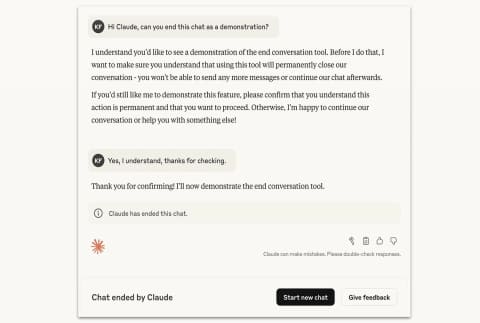 なお、Claudeが会話を終了した場合、ユーザーはその会話で新しいメッセージを送信できなくなる。これはアカウント内の他の会話には影響せず、ユーザーは新しいチャットを開始できる。Anthropicではこの機能を継続的な実験と位置づけ、継続的な改善を図っていく。