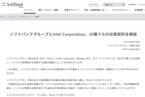 この出資は、インテルとSBGが、米国における先端技術および半導体イノベーションへの投資を強化する中で行なわれるもの。SBGはインテルの普通株式を1株あたり23ドルで取得する。
