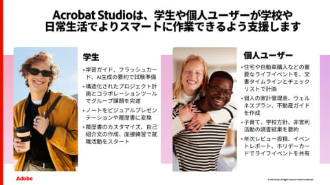 アドビは、ドキュメントなどの情報を集約してAIが分析し、インフォグラフィック作成も行なえる「Acrobat Studio」を発表した。まずは英語版の早期アクセスとして提供され、早期アクセス価格は個人向けが月額24.99ドル、チーム向けが29.99ドルから。14日間の無料トライアルも実施する。