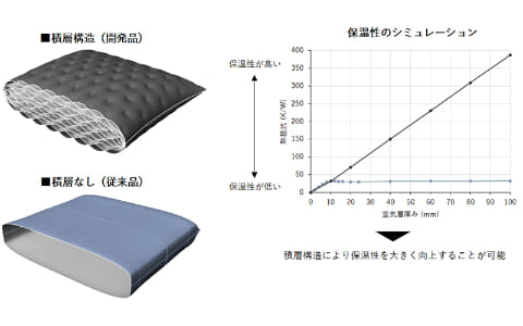 ただし空気層は、一定の厚みまでは保温性が向上するが、それ以上の厚みでは空気が対流してしまい保温性が向上しない。そのため、衣服において効果的な厚みを特定するために研究を重ねた。