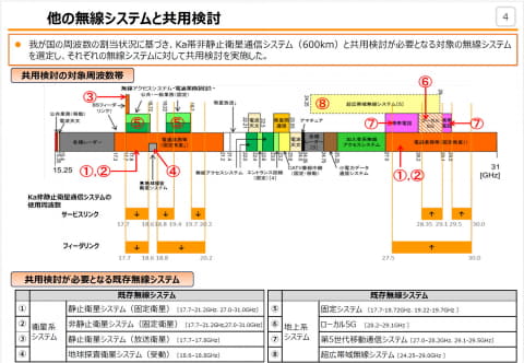 日本国内では、衛星-ゲートウェイ間の一部の周波数共用について事業者間で調整を実施し懸念を解消する方針。また、ほかの衛星コンステレーションとの干渉については衛星ダイバーシティを活用した干渉低減措置を講じる。このほか地上の5Gシステムなどとの干渉回避と共用の可能性についても報告。総務省は情報通信審議会向けの報告書(素案)で、ほかの無線システムとの周波数共用が可能と結論付けている。