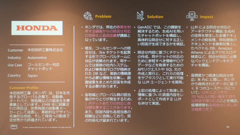 同じくホンダは、アフターサービスコールセンターの効率化にも活用。AIチャットボットを導入することで過去の問い合せデータを活用し、迅速・高精度な回答を実現している。これによりこれまで対応に数日かかっていた問題でも、数分で解決できるようになった。