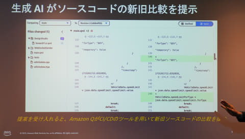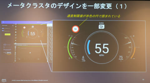 近年のSDV(Software Defined Vehicle)では、車のメーターなどがソフトウェアでデザインされており、後から変更も可能になる。しかし、現在は些細な変更であってもさまざまな人力による行程を経て行なわれるため、気軽に仕様変更できるものではない。AWSでは、こうした開発現場に、生成AIでのコーディングと仮想の実装環境を提供することで、迅速な仕様変更も可能にする。たとえば、メーターの一部の色を変更したい、というだけでも従来は多くの人力による行程が必要だったが、これを数分で実現することも可能になる。