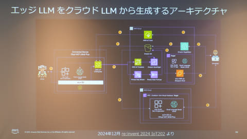 また今後、車の運転支援や情報収集を行なう車載のAIエージェントの普及も見込まれるが、普段はクラウド型のエージェントを使用していても、トンネル内部などではオフラインになって使えなくなってしまう。そのため車両側には小規模なエッジLLMによるAIエージェントを搭載する必要があるが、その開発や仮想環境での検証などにAWSを活用できるという。