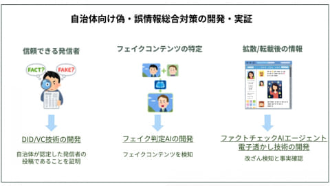 自治体向けの偽・誤情報対策では、情報の出所が確認できるDID(Decentralized Identifier)およびVC(Verifiable Credential)技術の開発に加えて、偽の画像や映像を見分けるフェイク検知技術や、情報の改ざん有無を判断する電子透かし技術とファクトチェックAIエージェントの構築を行なう。これらのシステムは統合し、長野県伊那市にて実証する。