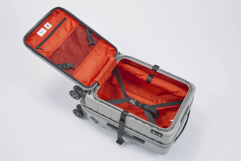 保管に向けた機能として、専用インナーケースが付属。インナーケースは、旅行時以外はスーツケース内に収納して保管するという使い方を想定している。スーツケースのカラーは、室内に置いても違和感がないよう、落ち着いたグレーを採用した。内装生地は薄暗い環境でも視認性を高めるエマージェンシーオレンジ。