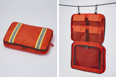収納部は、避難所や狭い宿泊施設でも開閉しやすいフロントオープン仕様、防災用品やかさばる荷物の収納に適した1気室構造とした。エキスパンダブル機能で容量拡張も可能。外装のフックなどを用いてヘルメットや吊下げポーチを外付けできる。吊下げポーチは反射材により夜間の安全性向上も図れる。また、横置き時の安定性を確保し、荷物掛けとしても使えるフック付き底足台座を備える。