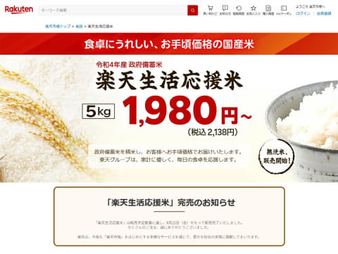 楽天では、政府から随意契約で購入した備蓄米を「楽天生活応援米」として商品化。「楽天市場」で楽天が直営店舗として運営する「楽天24」と「Rakutenグルメ館」、楽天マートが運営するネットスーパー「楽天マート」の3つの販売チャネルで販売した。開始から86日間で予約販売分も含めたすべての商品の販売を完了し、発送は9月中旬をめどに完了予定。