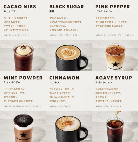 また、店舗ではコーヒービバレッジのアレンジを楽しめる「コーヒーディスカバリーカウンター」も設置。カカオニブや黒糖、ピンクペッパーなど6種のコンディメントを自由に組み合わせて、自分好みの味を見つける体験が可能。