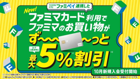 「ファミマカード」は、ファミリーマート店舗での決済に利用した場合、会計金額の3%が請求時に割引される。ファミマのアプリ「ファミペイ」とのファミペイ連携で、割引率は最大5%になる。割引はカード利用代金の請求時に適用され、レシートに割引金額は表示されない。