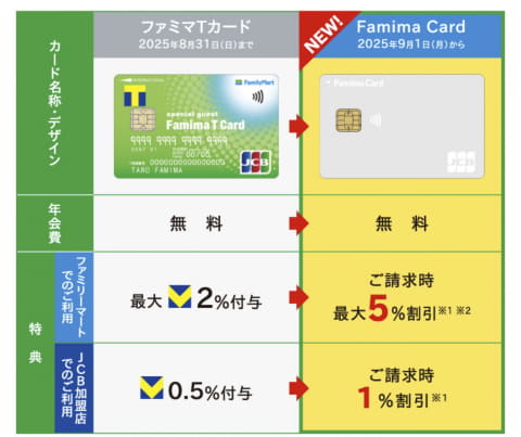 なお、これまで展開されていた「ファミマTカード」の特典は8月31日でサービスを終了する。既存会員は9月1日から上記「ファミマカード」の新特典に切り替わる。ファミマTカードは2007年から提供されており、発行枚数は460万枚超。