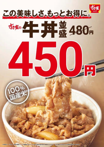 牛丼チェーン店の「すき家」は9月4日9時から、「牛丼」を値下げする。現在の並盛480円から450円へ、30円の値下げとなる。