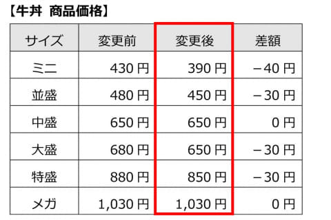 並盛のほか、ミニは40円値下げの390円、大盛りと特盛も30円値下げで、650円、850円となる。なお、中盛りとメガは価格改定を行なわない。