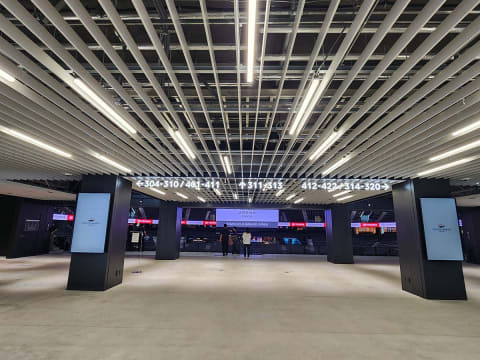 メインゲートはスタンド3階西側に設置。入場するとすぐにボウル内 メインビジョンが見え、会場音とあわせて非日常空間となる。コンコースとアリーナを隔てる扉を排除し、会場に没入させる設計とした。