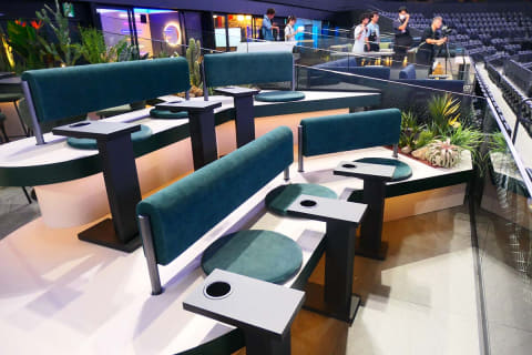 PLAYERS LOUNGEは、選手ロッカールームからコートまでの場所に設置されており、選手がコートに向かう様子を間近で見ることができる。食事はビュッフェ形式で、自分で作るハンバーガーやホットドッグなどフィンガーフードをメインとした食事を提供予定。