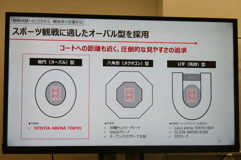 観客席の形状は楕円(オーバル)型を採用。近年新たに開業しているアリーナ施設はU字(馬蹄)型が多いが、バスケットボールの見やすさにこだわり、どの席からも正対で見える形状にしたという。