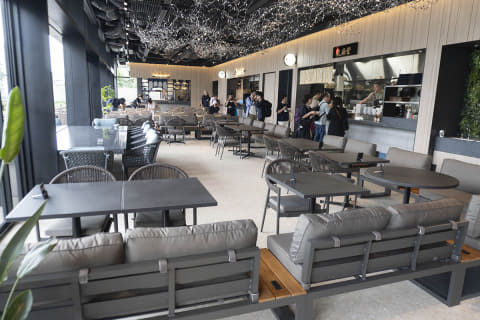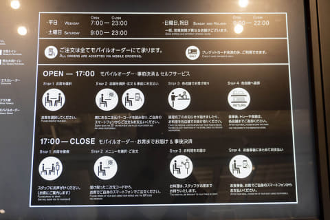 ダイニングホールはともにモバイルオーダー形式を採用。日中は利用者が商品を受け取りに行くセルフサービスだが、17時以降はレストラン方式でスタッフが料理や飲み物をサーブする形となる。