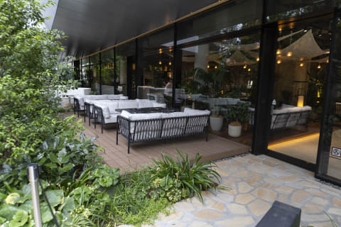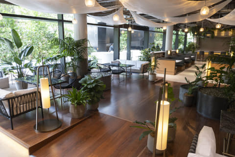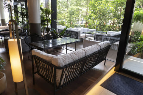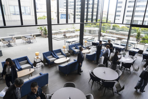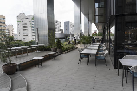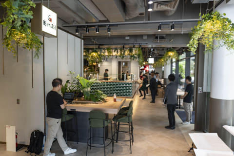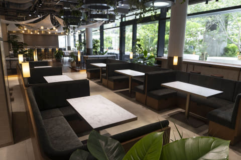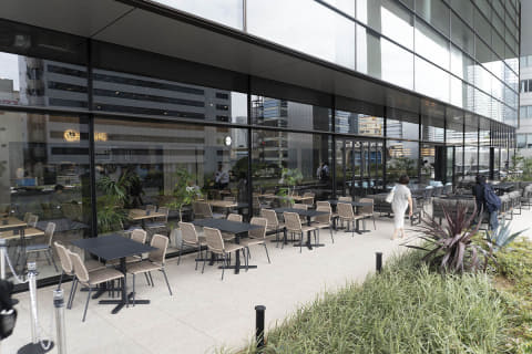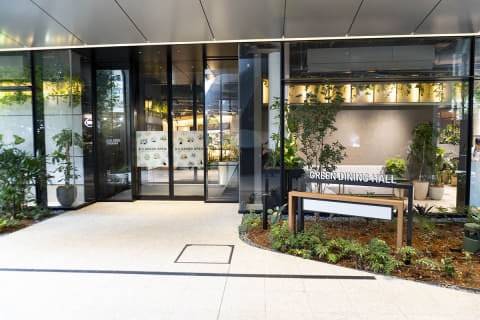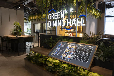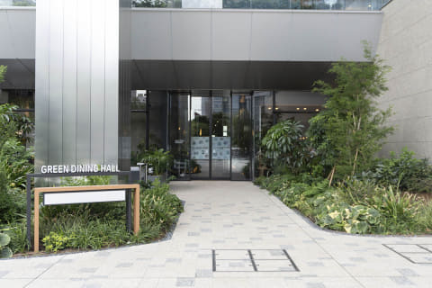 1階のグリーンダイニングホールは、緑に包まれた空間が特徴。テラス席も含めて共用席約350席を設けている。JR浜松町駅から芝浦エリアをつなぐ歩行者動線「GREEN WALK」からも入場可能。