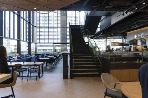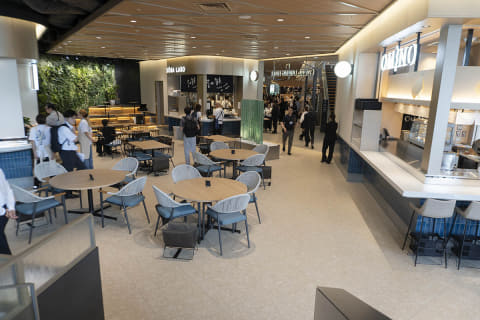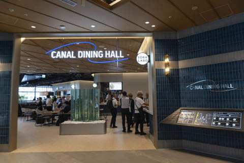 商業エリアの特徴は共用席を多く用意している点。フードコート形式を採用した「GREEN DINING HALL(グリーンダイニングホール)」と「CANAL DINING HALL(キャナルダイニングホール)」を設け、異なる食ニーズの人同士が同じテーブルで食事を共にできるようにした。また、飲食物の持ち込みや、仕事、勉強、読書などでの利用も可能。