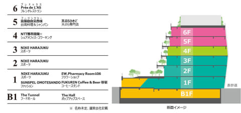 規模は地上6階・地下2階、塔屋1階で、地下1階から6階に物販店舗、飲食店舗、サービス店舗を展開する。敷地面積は1,956.49m2、延床面積は7,513.18m2。9月にオープンするのは1~3階の「NIKE HARAJUKU」。