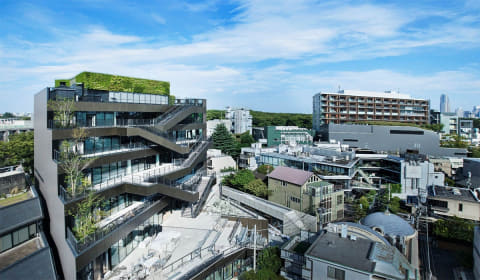 表参道側は垂直性と透明性を意識した外観を採用。ガラス面に街路樹が映し出される設計となっている。表参道から続くパサージュの先には、小さな店舗や広場、アートスケープを配置した。