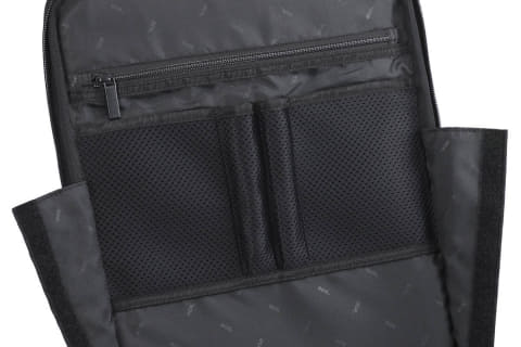 内装にはPC周辺機器を収納できるファスナーポケットやオープンポケットを配置。PC収納部は背面に独立した形で備えている。内側はガジェットに細かな傷が付くのを防ぐためパイル生地を採用した。