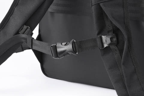 背面下部は、擦れによる衣類の摩耗を軽減するため、ナイロン生地に切り替えている。ショルダーハーネスにはフィット感を高める可動式チェストベルトを装備。