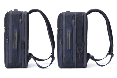 機能面ではシリーズの特徴である、「手に持つ」「棚に上げる」「前に抱える」のそれぞれで使用しやすい仕様を取り入れている。着用者にも邪魔になりにくい薄マチ形状ながら、書類やノートPCなどの荷物が効率良く入るスクエア型で、容量を確保している点も特徴。