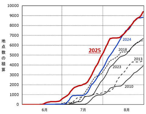 気象庁は、2025年の梅雨入り、梅雨明けと、夏期(6~8月)の記録的な高温について発表した。今年は全国的に梅雨明けがかなり早い傾向で、夏の平均気温は1898年の統計開始以来、最も高くなった。