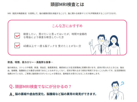 Mini人間ドックで受けられるのは、MRI(頭部)、CT(胸部または腹部)、エコー(乳腺または腹部)、いずれか最大年1回まで受検でき、サイトから予約を行ないます。追加で検査したい場合は、1回につき5,000円で利用することも可能です。検査は最短15分程度で完了し、結果は後日電子データのレポートで受け取れます。