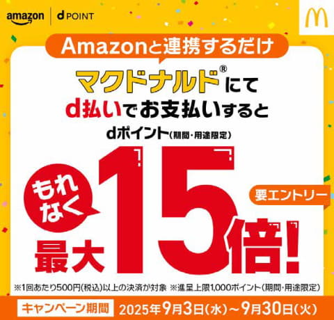 NTTドコモは、Amazonアカウントとdアカウントを連携させると、マクドナルドのd払いでdポイントの還元が最大15倍になるキャンペーンを開始した。期間は9月3日~30日。