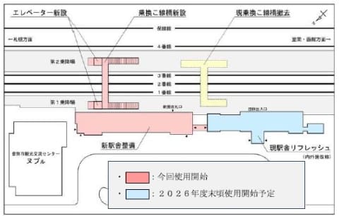JR北海道は、登別駅の新駅舎、エレベーター、乗換こ線橋が完成したと発表した。10月11日に使用開始する。現駅舎はリフレッシュ工事を行ない、待合スペースとして26年度末ごろより使用開始する。