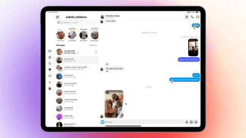 iPad版アプリは、モバイル版と比べて大きな画面を活かした最適化が行なわれ、より少ないタップ数でリールやDM機能などへアクセスできる。アプリを開くとリール動画が表示され、再生しながらコメント欄を開くことも可能。メッセージ画面では、会話相手の一覧を表示しながらDMの送受信が行なえる。